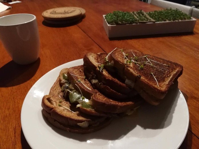 That’s a swiss and cheddar grilled cheese with onions, mushrooms, and green peppers made with micro-greens grown right from a Sprout prototype!