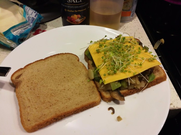 - On one slice of bread, layer swiss cheese, sauteed vegetables, cheddar cheese, and sprouts. Add the other slice of bread.